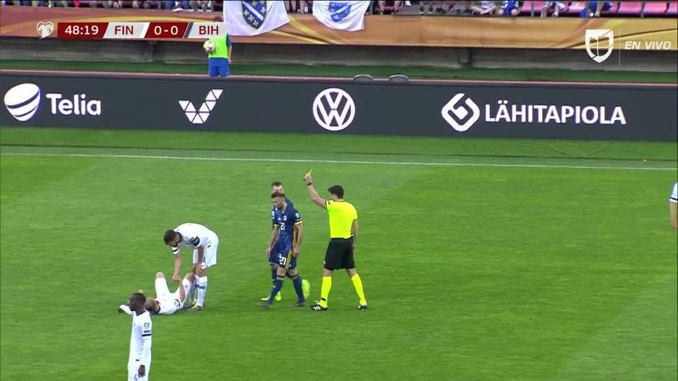 Tarjeta amarilla. El árbitro amonesta a Elvis Saric de Bosnia and Herzegovina