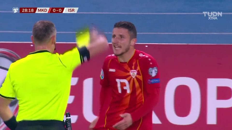 Tarjeta amarilla. El árbitro amonesta a Enis Bardhi de North Macedonia