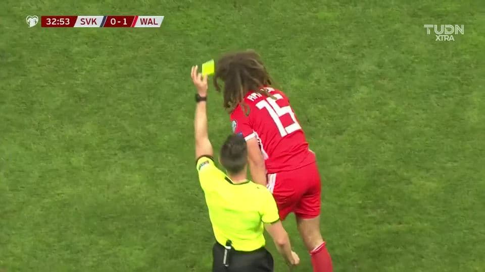Tarjeta amarilla. El árbitro amonesta a Ethan Ampadu de Wales