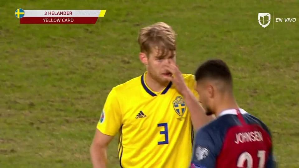 Tarjeta amarilla. El árbitro amonesta a Filip Helander de Sweden