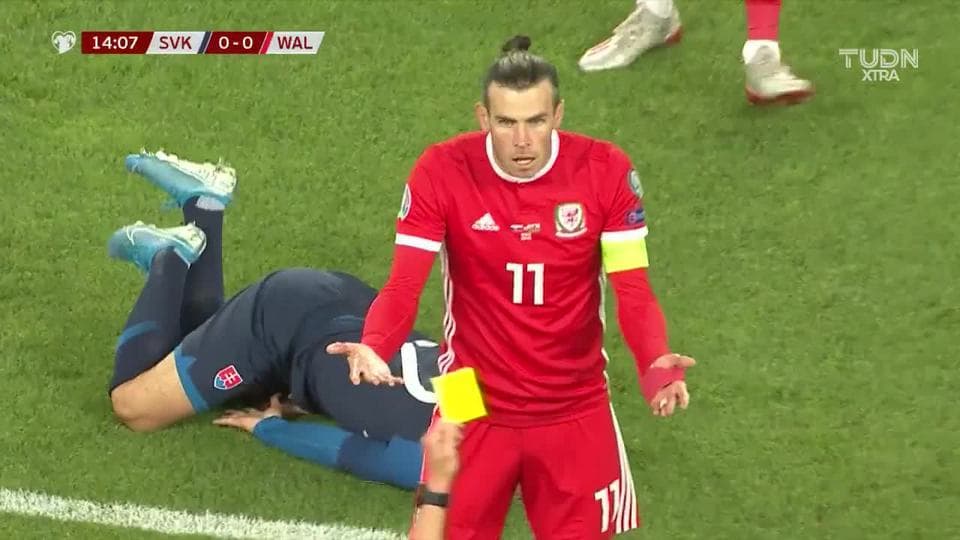 Tarjeta amarilla. El árbitro amonesta a Gareth Bale de Wales