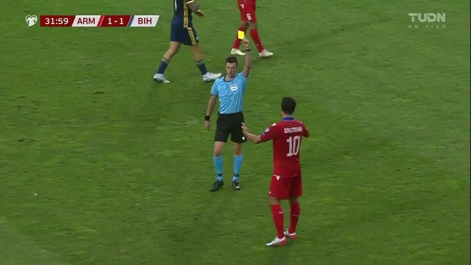 Tarjeta amarilla. El árbitro amonesta a Gevorg Ghazaryan de Armenia