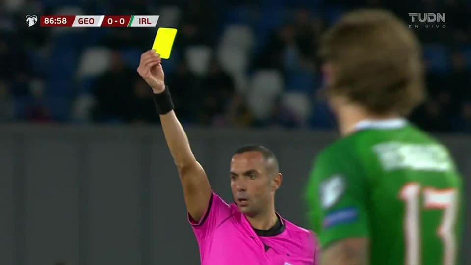 Tarjeta amarilla. El árbitro amonesta a Gia Grigalava de Georgia