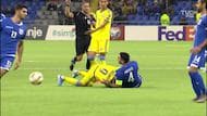 Tarjeta amarilla. El árbitro amonesta a Giorgios Merkis de Cyprus