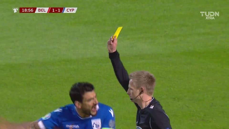 Tarjeta amarilla. El árbitro amonesta a Giorgios Merkis de Cyprus on November 19, 2019