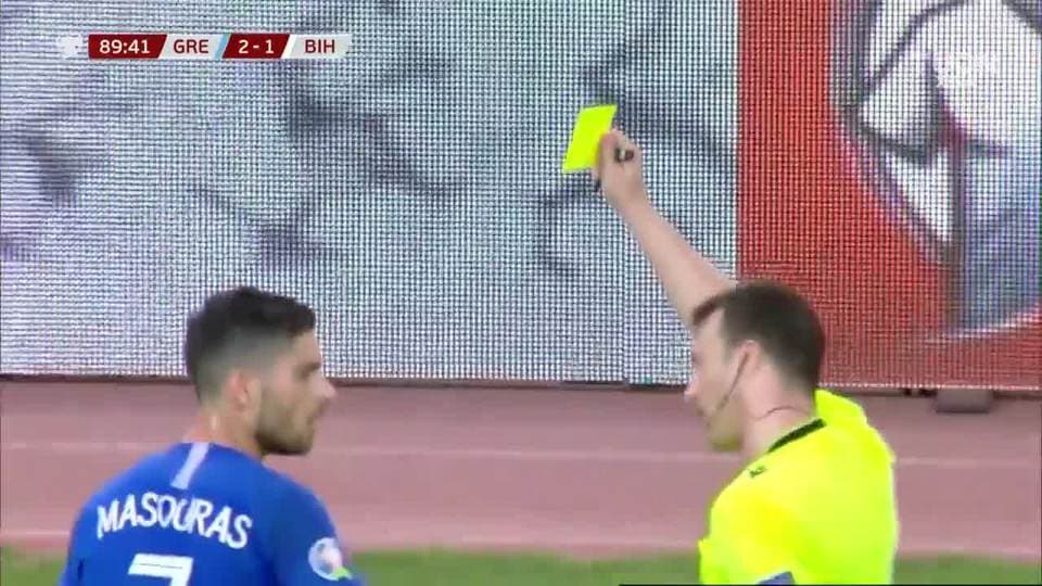 Tarjeta amarilla. El árbitro amonesta a Giorgos Masouras de Greece