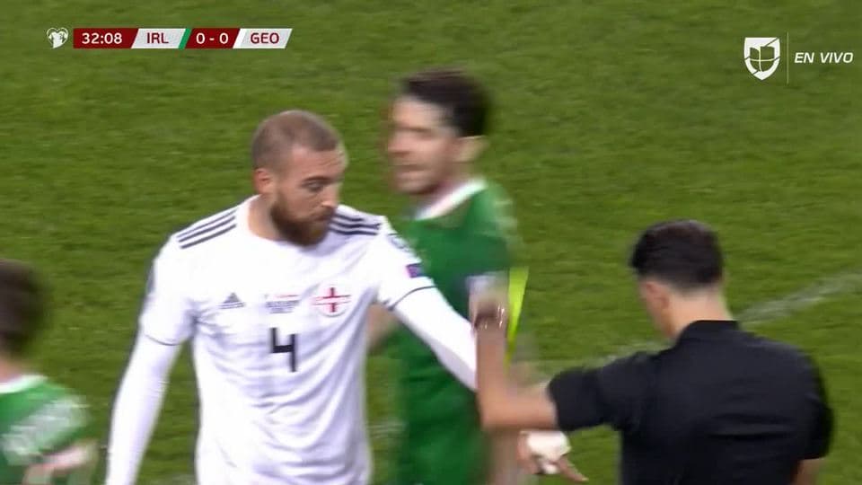 Tarjeta amarilla. El árbitro amonesta a Guram Kashia de Georgia