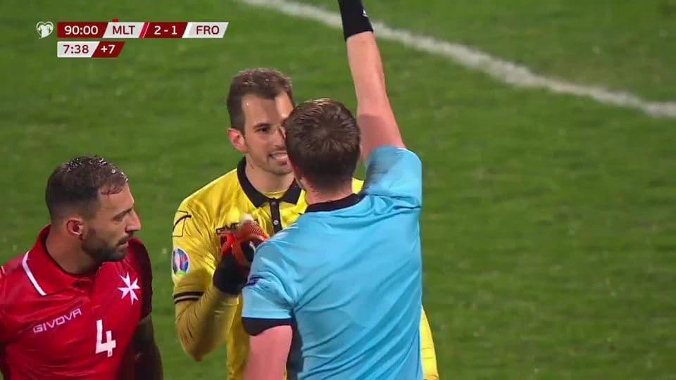 Tarjeta amarilla. El árbitro amonesta a Henry Bonello de Malta on March 23, 2019