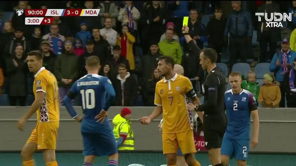Tarjeta amarilla. El árbitro amonesta a Igor Armas de Moldova on September 7, 2019