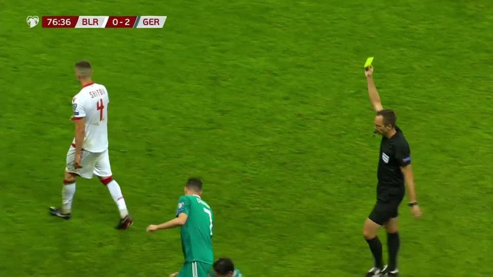 Tarjeta amarilla. El árbitro amonesta a Igor Shitov de Belarus on June 8, 2019