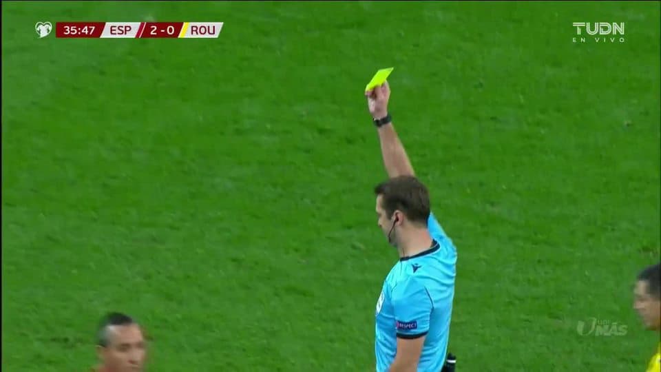 Tarjeta amarilla. El árbitro amonesta a Ionut Nedelcearu de Romania on November 18, 2019