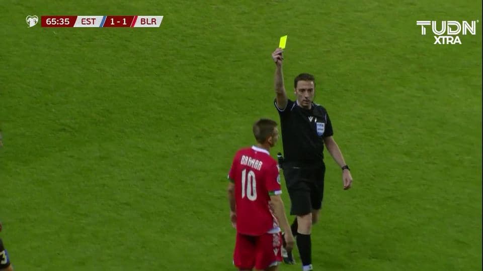 Tarjeta amarilla. El árbitro amonesta a Ivan Bakhar de Belarus