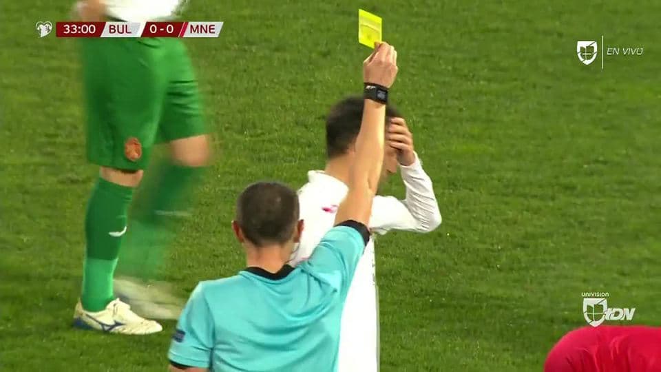 Tarjeta amarilla. El árbitro amonesta a Ivelin Popov de Bulgaria on March 22, 2019