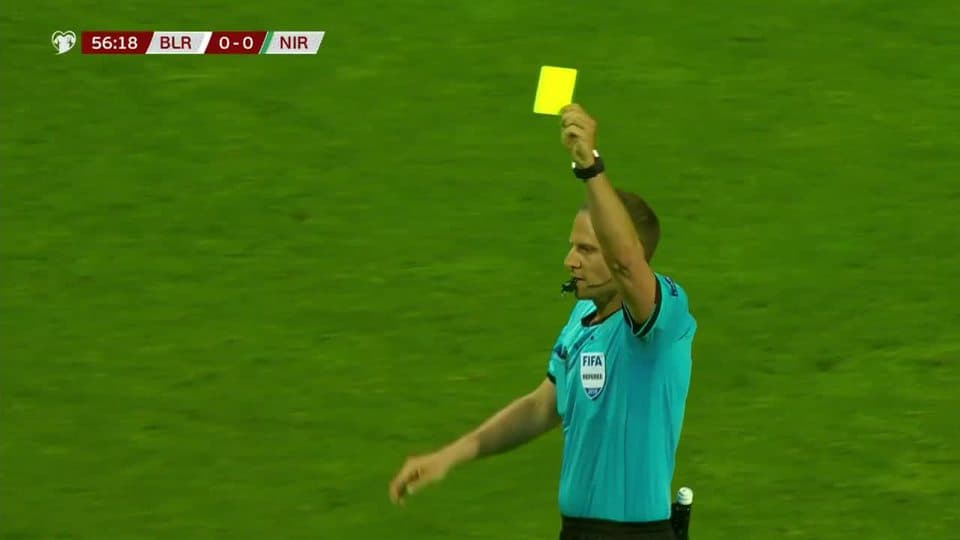 Tarjeta amarilla. El árbitro amonesta a Jamal Lewis de Northern Ireland on June 11, 2019
