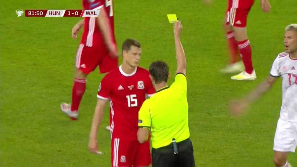 Tarjeta amarilla. El árbitro amonesta a Jamie Lawrence de Wales on June 11, 2019