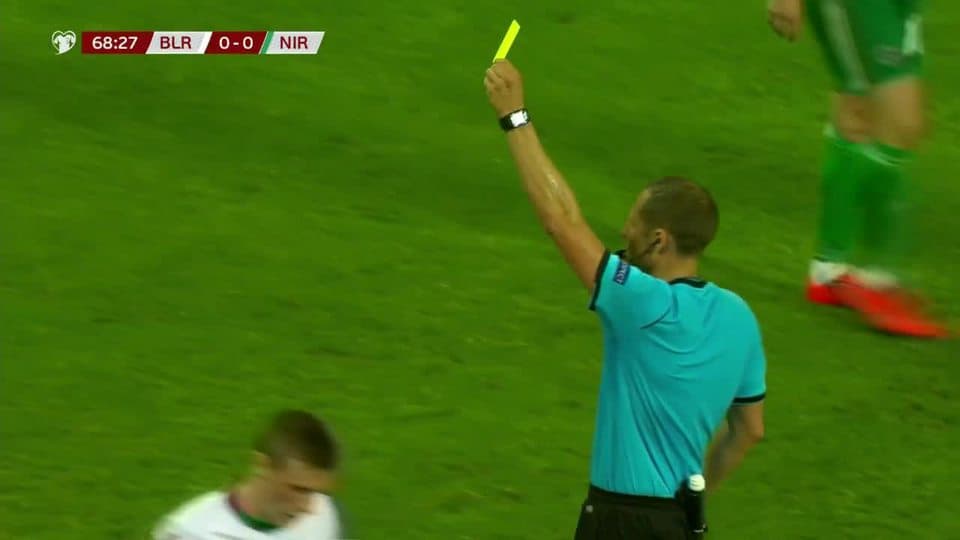 Tarjeta amarilla. El árbitro amonesta a Jonny Evans de Northern Ireland on June 11, 2019