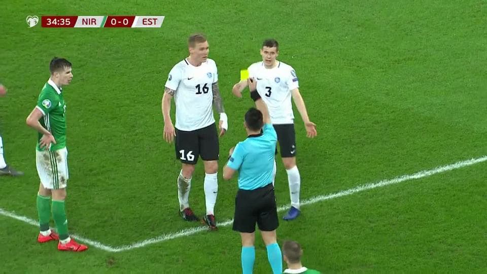 Tarjeta amarilla. El árbitro amonesta a Joonas Tamm de Estonia on March 21, 2019
