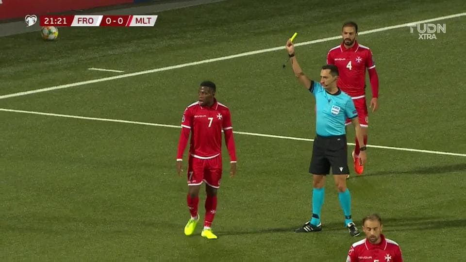 Tarjeta amarilla. El árbitro amonesta a Joseph Mbong de Malta