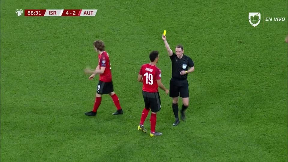 Tarjeta amarilla. El árbitro amonesta a Karim Onisiwo de Austria