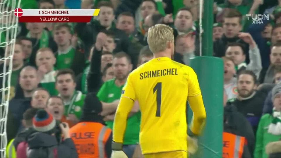 Tarjeta amarilla. El árbitro amonesta a Kasper Schmeichel de Denmark on November 18, 2019