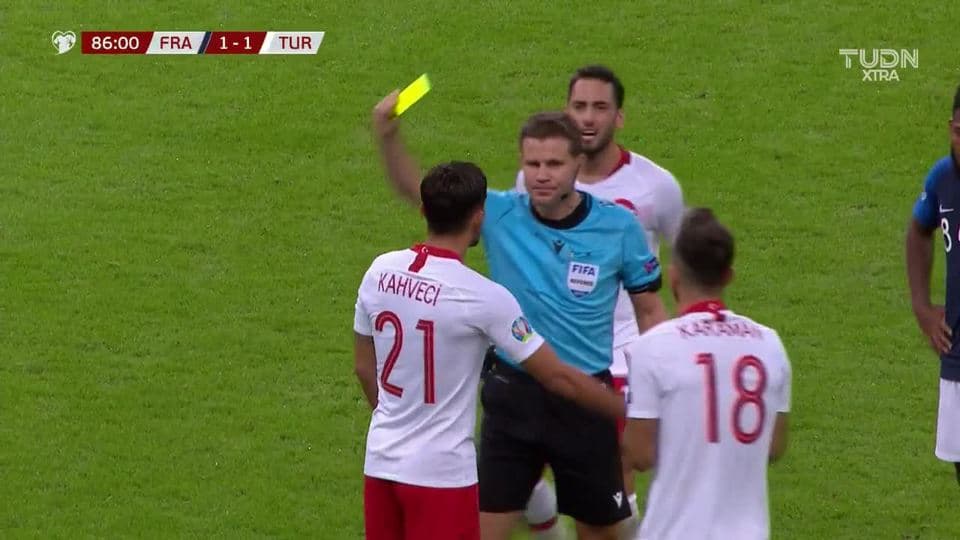 Tarjeta amarilla. El árbitro amonesta a Kenan Karaman de Turkey on October 14, 2019