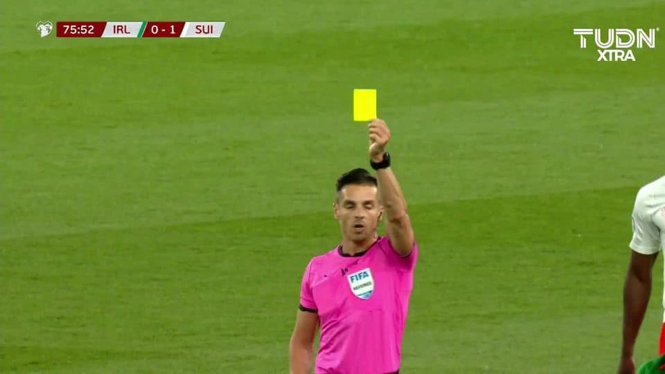 Tarjeta amarilla. El árbitro amonesta a Kevin Mbabu de Switzerland
