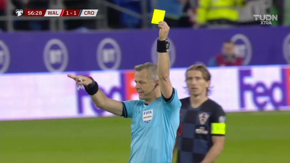 Tarjeta amarilla. El árbitro amonesta a Kieffer Moore de Wales