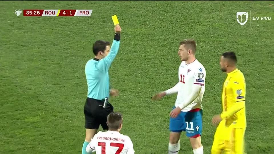 Tarjeta amarilla. El árbitro amonesta a Klaemint Olsen de Faroe Islands