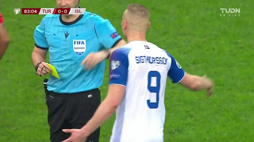Tarjeta amarilla. El árbitro amonesta a Kolbeinn Sigthorsson de Iceland on November 14, 2019
