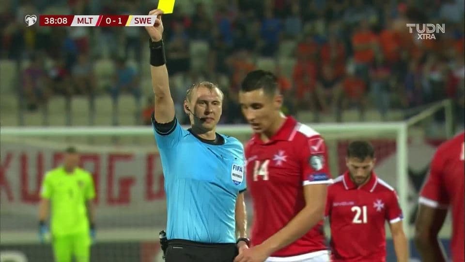 Tarjeta amarilla. El árbitro amonesta a Kurt Shaw de Malta