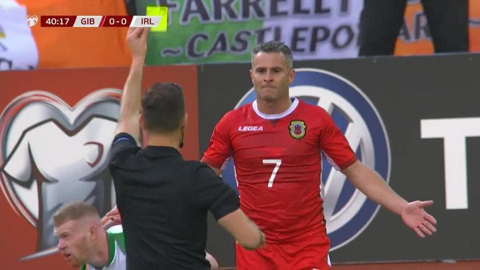Tarjeta amarilla. El árbitro amonesta a Lee Casciaro de Gibraltar