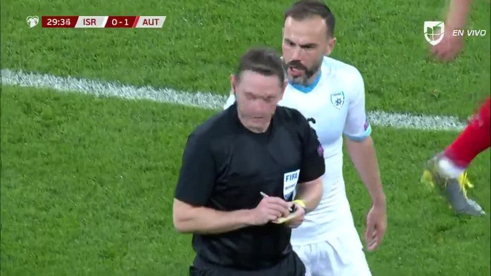 Tarjeta amarilla. El árbitro amonesta a Loai Taha de Israel on March 24, 2019