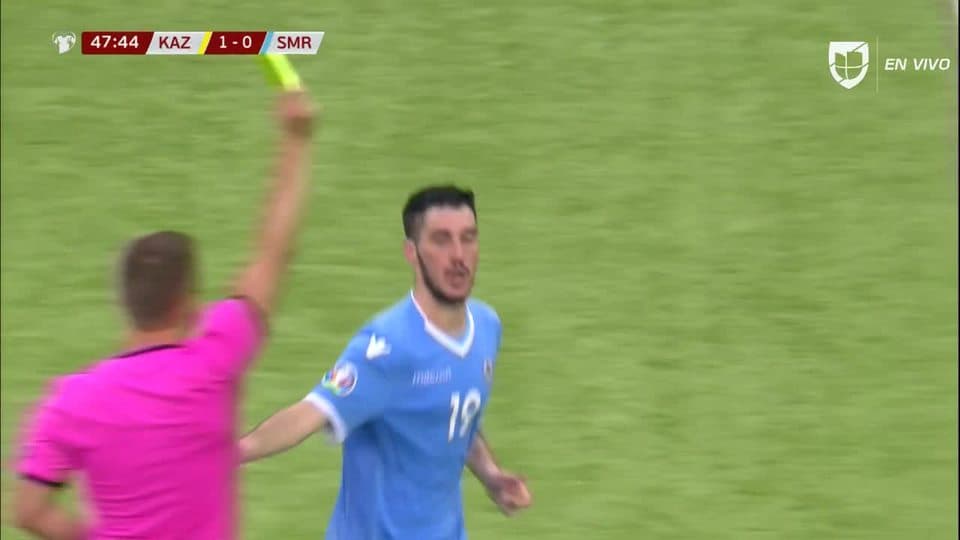 Tarjeta amarilla. El árbitro amonesta a Luca Censoni de San Marino