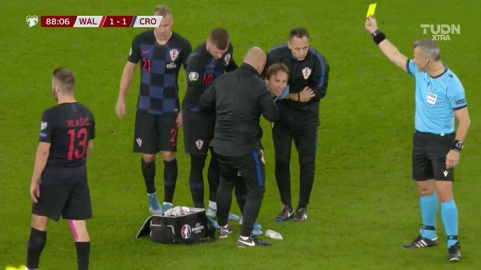 Tarjeta amarilla. El árbitro amonesta a Luka Modric de Croatia on October 13, 2019