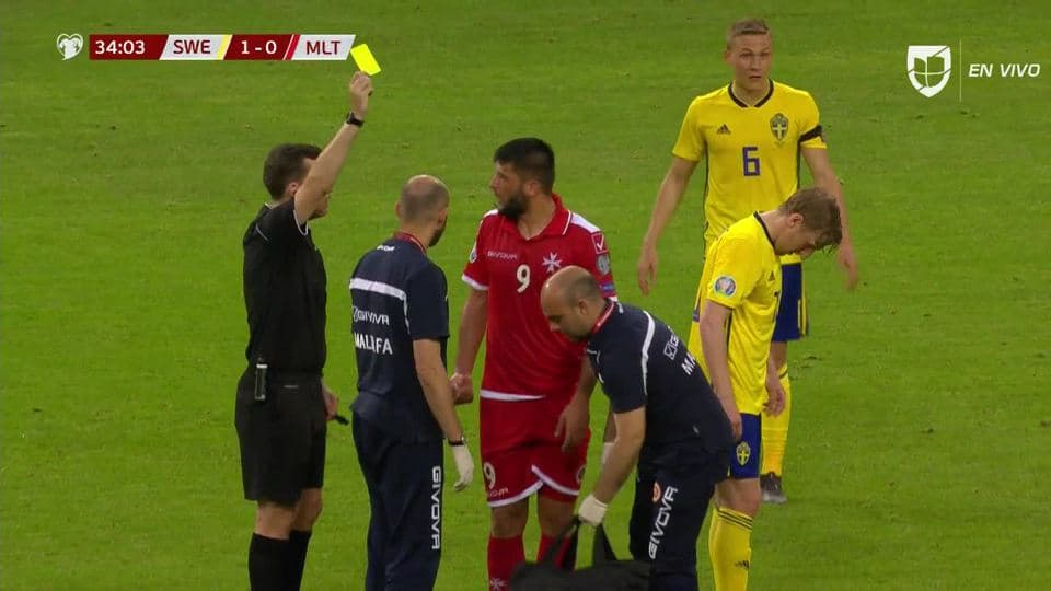 Tarjeta amarilla. El árbitro amonesta a Luke Montebello de Malta