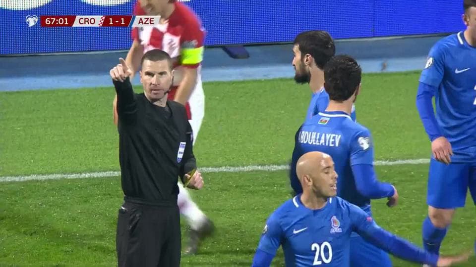 Tarjeta amarilla. El árbitro amonesta a Maksim Medvedev de Azerbaijan on March 21, 2019