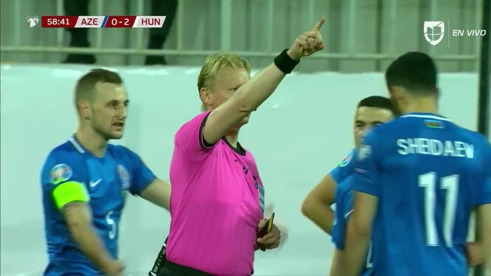 Tarjeta amarilla. El árbitro amonesta a Maksim Medvedev de Azerbaijan