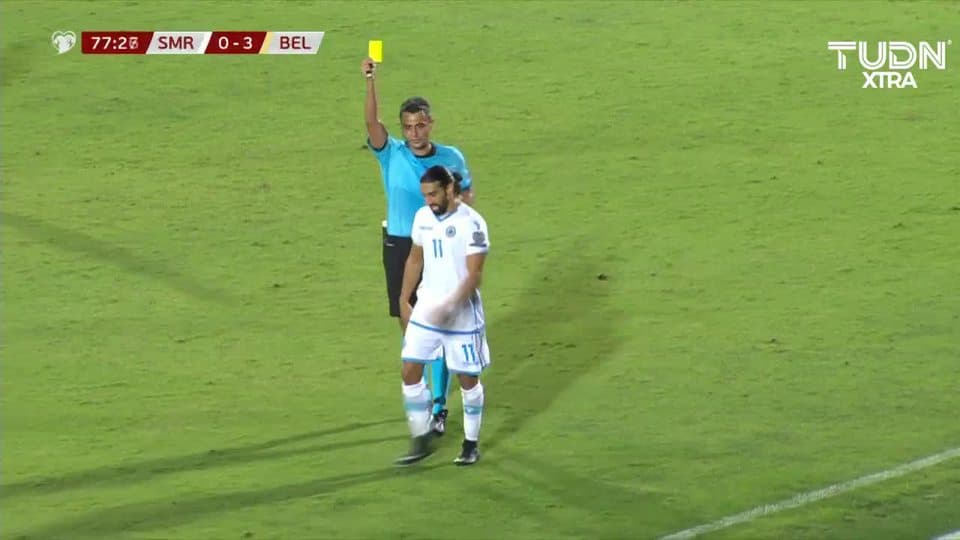 Tarjeta amarilla. El árbitro amonesta a Manuel Battistini de San Marino