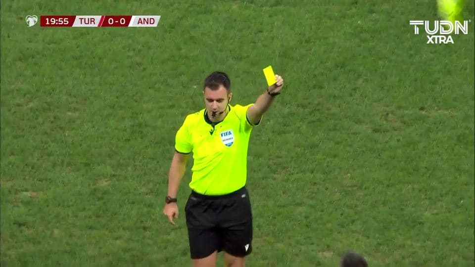 Tarjeta amarilla. El árbitro amonesta a Marc Vales de Andorra on September 7, 2019