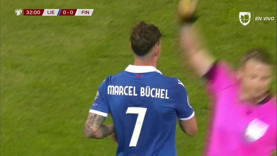Tarjeta amarilla. El árbitro amonesta a Marcel Büchel de Liechtenstein
