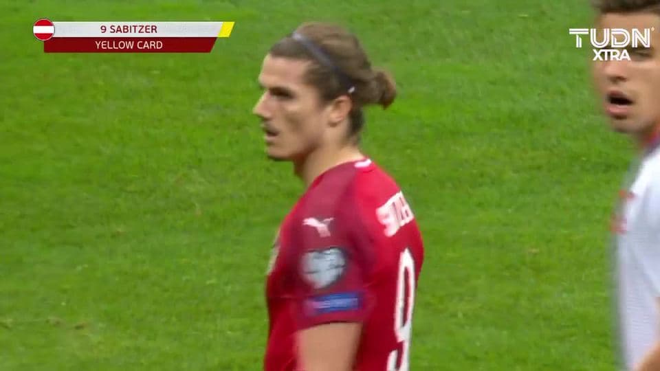 Tarjeta amarilla. El árbitro amonesta a Marcel Sabitzer de Austria
