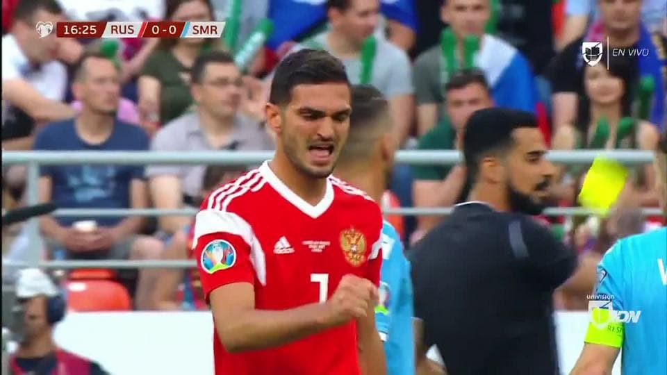 Tarjeta amarilla. El árbitro amonesta a Marcello Mularoni de San Marino on June 8, 2019