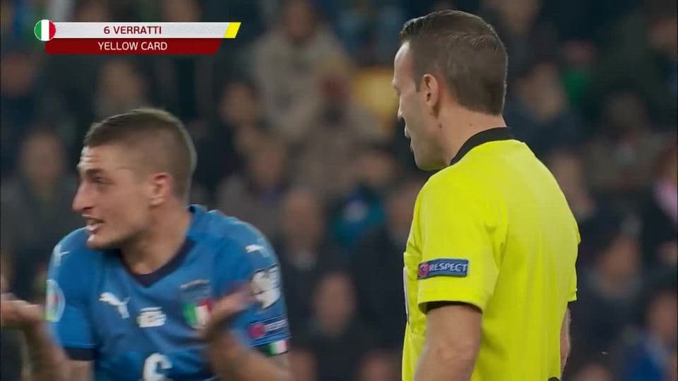 Tarjeta amarilla. El árbitro amonesta a Marco Verratti de Italy