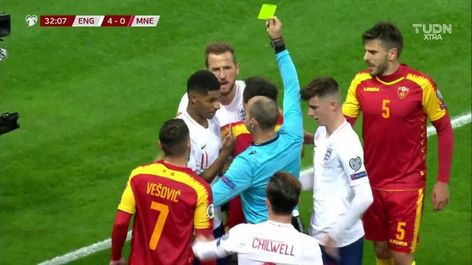 Tarjeta amarilla. El árbitro amonesta a Marcus Rashford de England on November 14, 2019