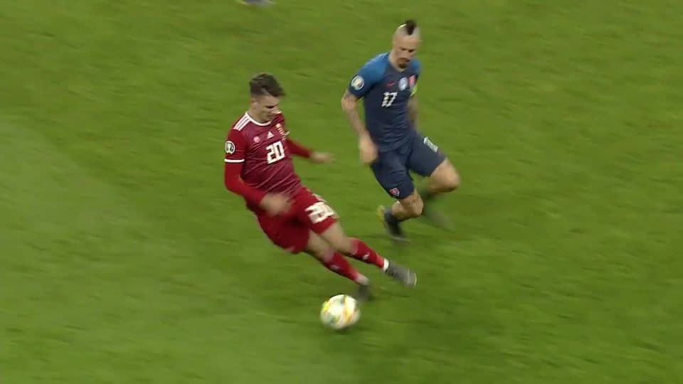 Tarjeta amarilla. El árbitro amonesta a Marek Hamsik de Slovakia on March 21, 2019