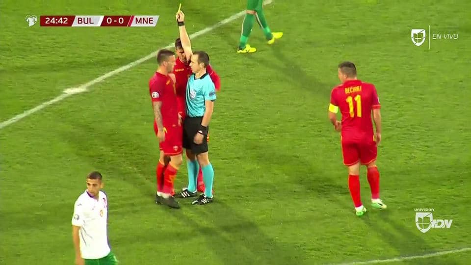 Tarjeta amarilla. El árbitro amonesta a Marko Simic de Montenegro on March 22, 2019