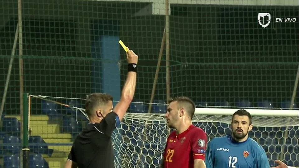 Tarjeta amarilla. El árbitro amonesta a Marko Simic de Montenegro on June 7, 2019