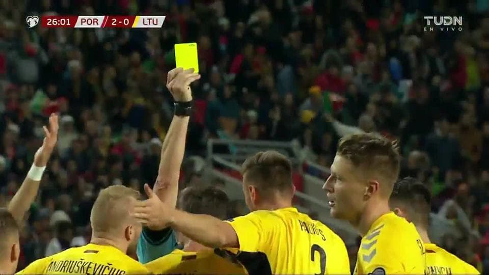 Tarjeta amarilla. El árbitro amonesta a Markus Palionis de Lithuania on November 14, 2019