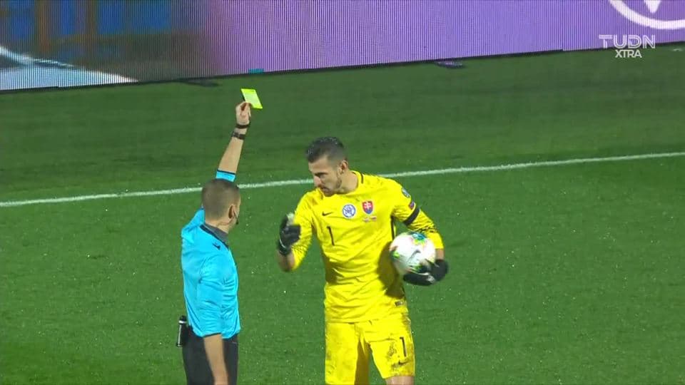 Tarjeta amarilla. El árbitro amonesta a Martin Dubravka de Slovakia