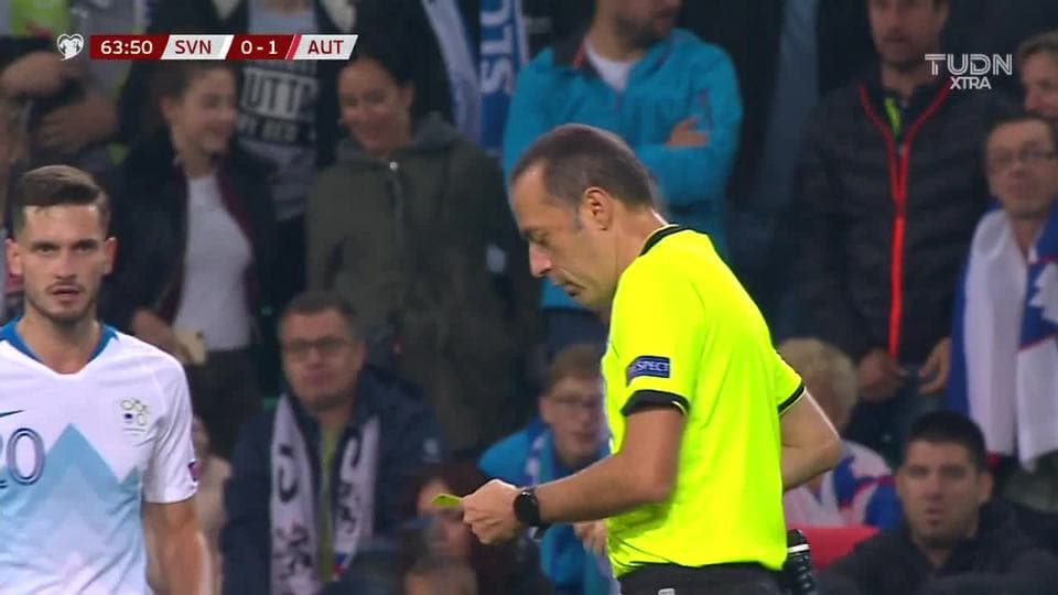Tarjeta amarilla. El árbitro amonesta a Martin Hinteregger de Austria on October 13, 2019